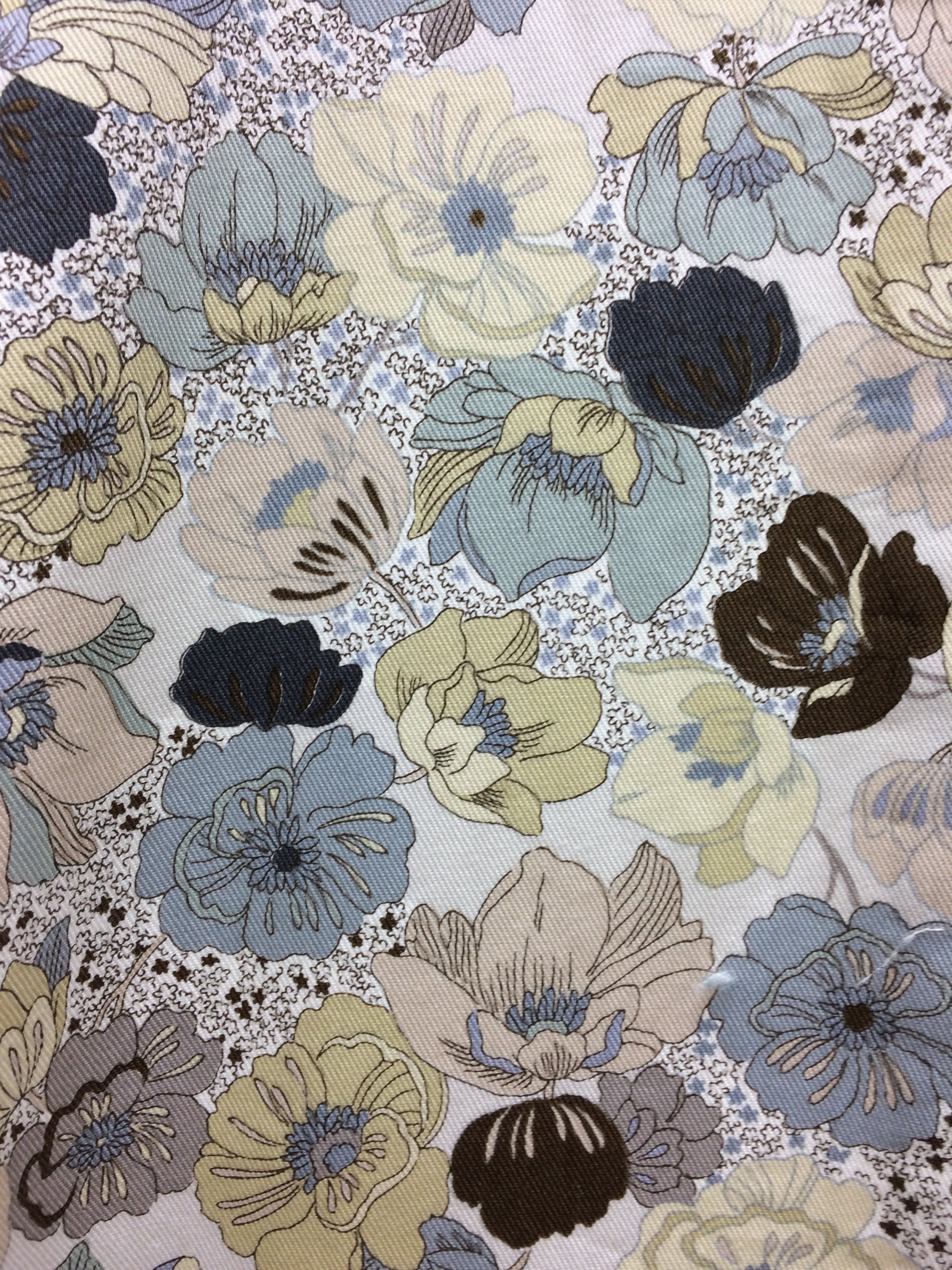 オフホワイトの地に多色の洋花の総柄小紋です。洋花なので洋服の中でも馴染むので、気軽にお召になれます。3枚目の写真の様な半幅帯やさっぱり系の気持ち大きめなポイント柄の名古屋帯なんかを合わせるとお洒落ですよ。素材は綿なのでご自宅で洗濯もできます。仕立ては広衿単衣仕立てになっています。寸法は身丈が背から4尺3寸5分(約164.5cm)、袖丈が1尺3寸(約49cm)、裄が1尺7寸8分(約67.5cm)、肩巾が8寸8分(約33.5cm)、袖巾が9寸(約34cm)、前巾が6寸3分(約24cm)、後巾が7寸8分(約29.5cm)、繰り越しが8分(約3cm)、褄下が2尺1寸5分(約81.5cm)です。ご不明な点がございましたらお気軽にお問い合わせ下さい。